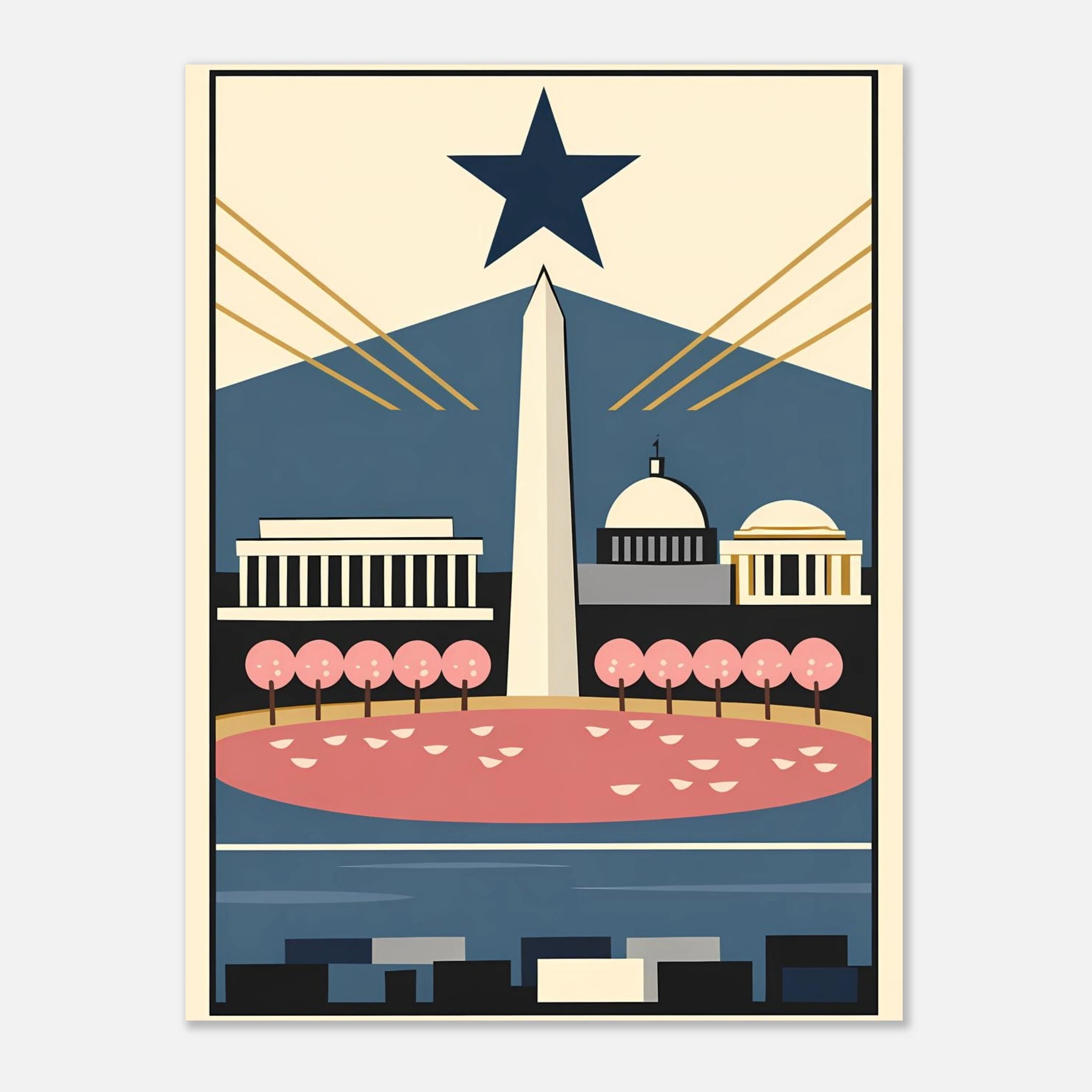A minimalist Bauhaus-style illustration of Washington DC featuring the Washington Monument, historic landmarks, and cherry blossoms along the Tidal Basin. Clean geometric forms and bold colors create a timeless tribute to the capital.